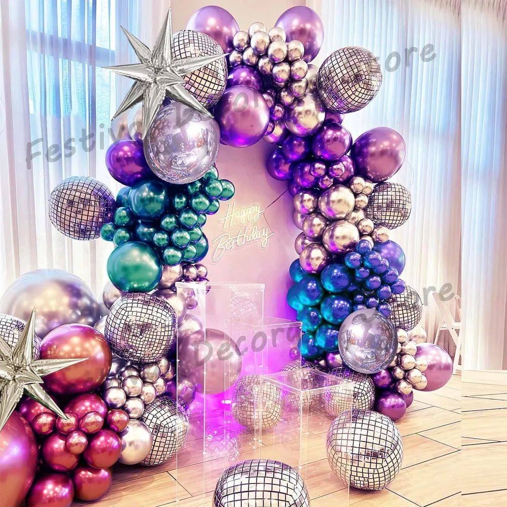 98/142pcs Metallic Purple Sliver Balloon Garland 4D Disco Ball for 80s 90s Adult Birthday Graduation Happy New Year Party Decor