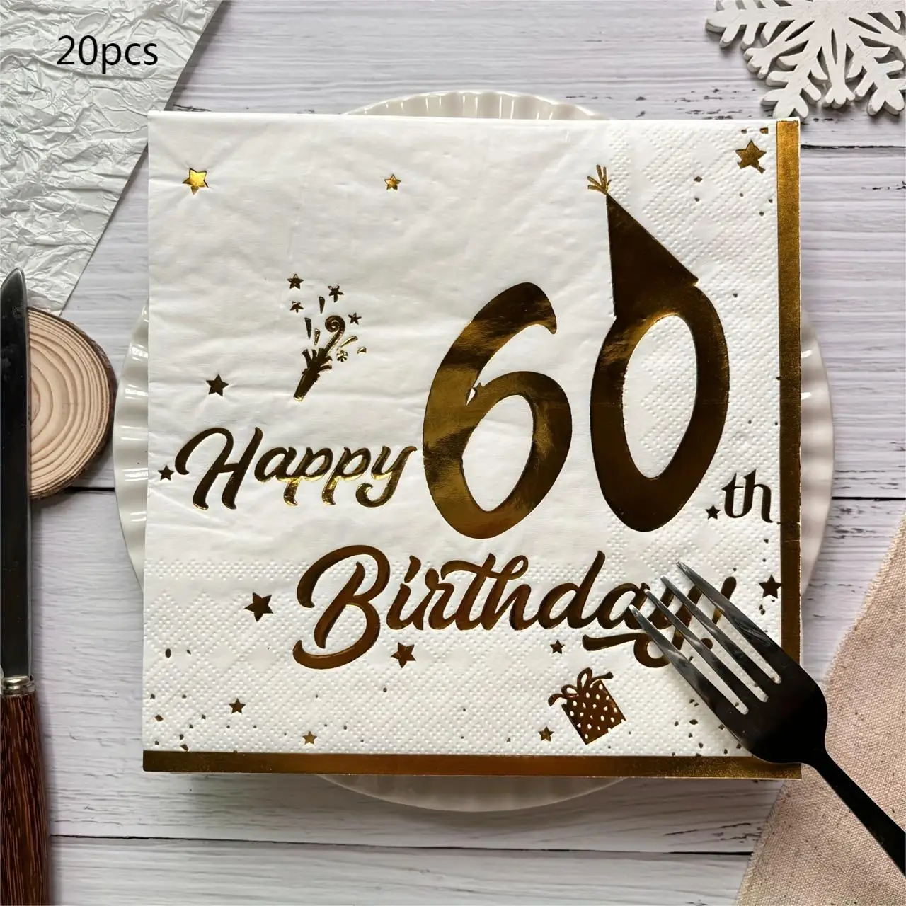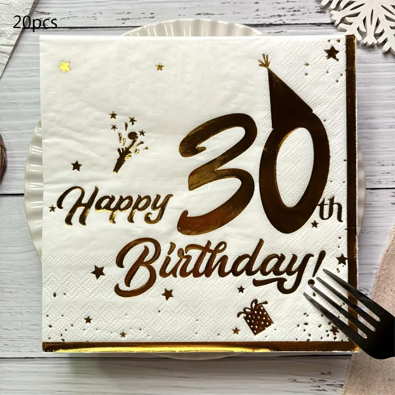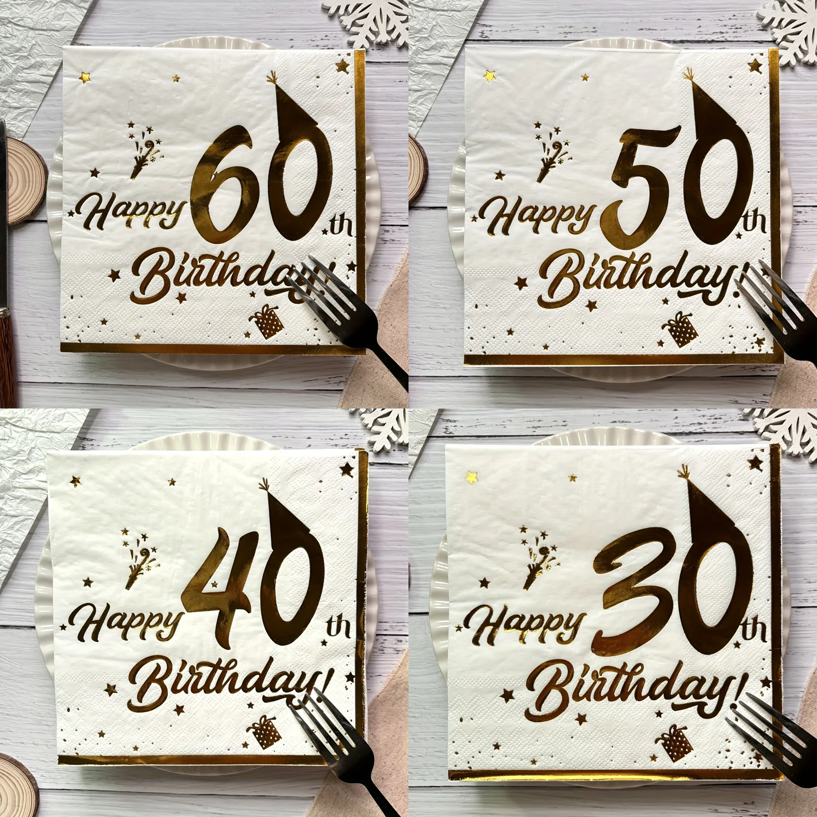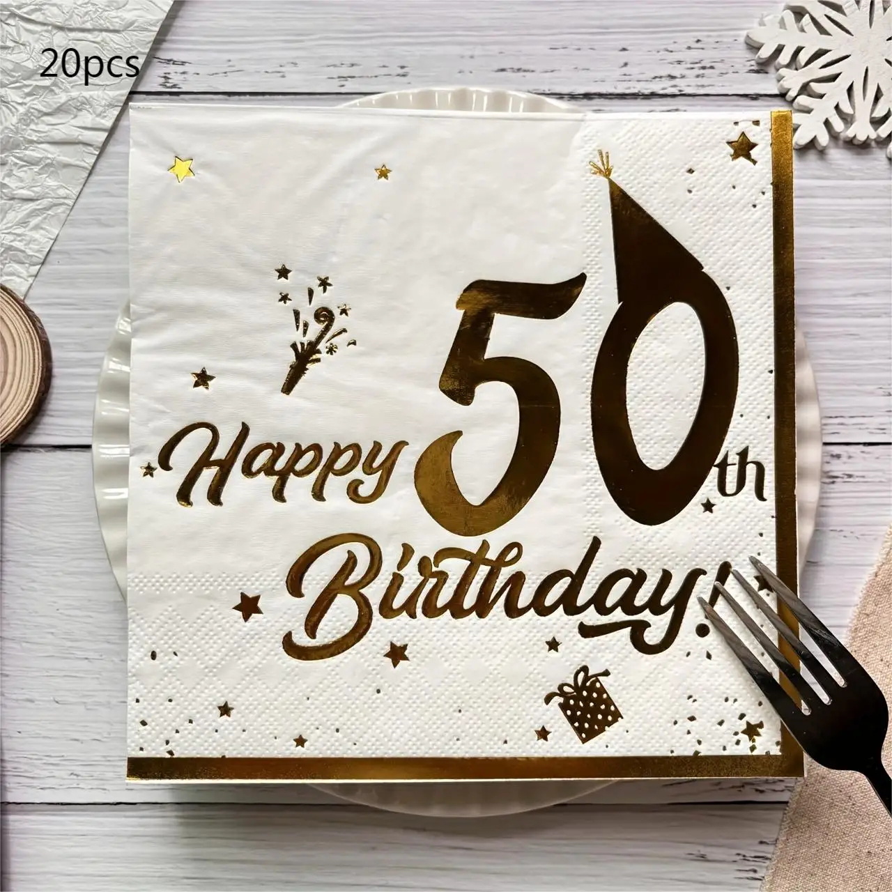 20 Pcs Happy Birthday Napkins White and Gold, Tableware Party Napkins, Birthday Decorations Tissue Luncheon Paper Napkin